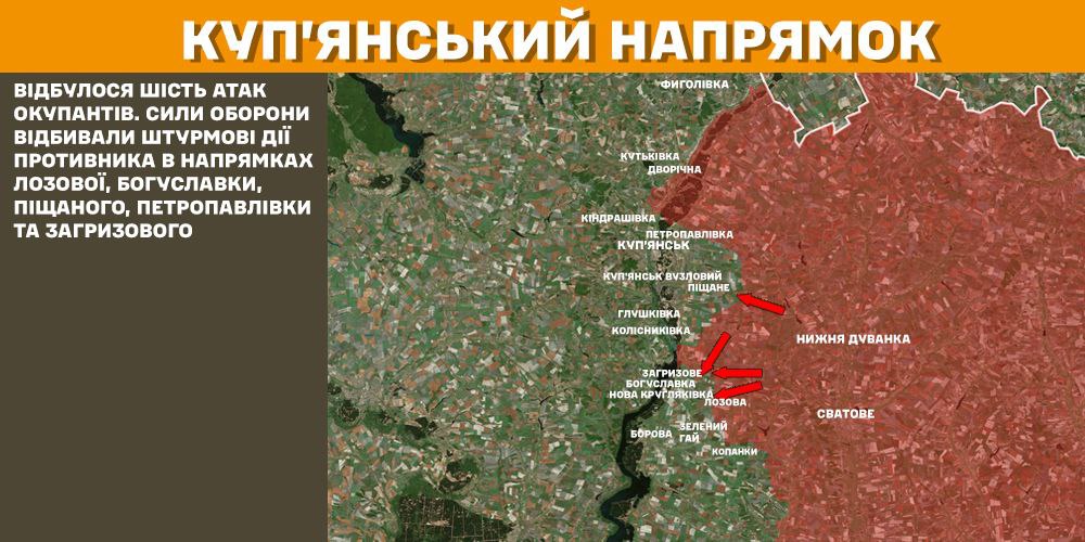 На Куп"янському напрямку окупанти здійснили шість штурмів, намагаючись просунутися в районах Лозової, Богуславки, Піщаного, Петропавлівки та Загризового.