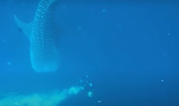 Китова акула ширяла навколо людини з жахливим виглядом так, ніби вона відміряє людину, щоб проковтнути. Однак, більше зацікававшись не дайвером, а бульбашками повітря з його аквалангу, акула залишила людину.