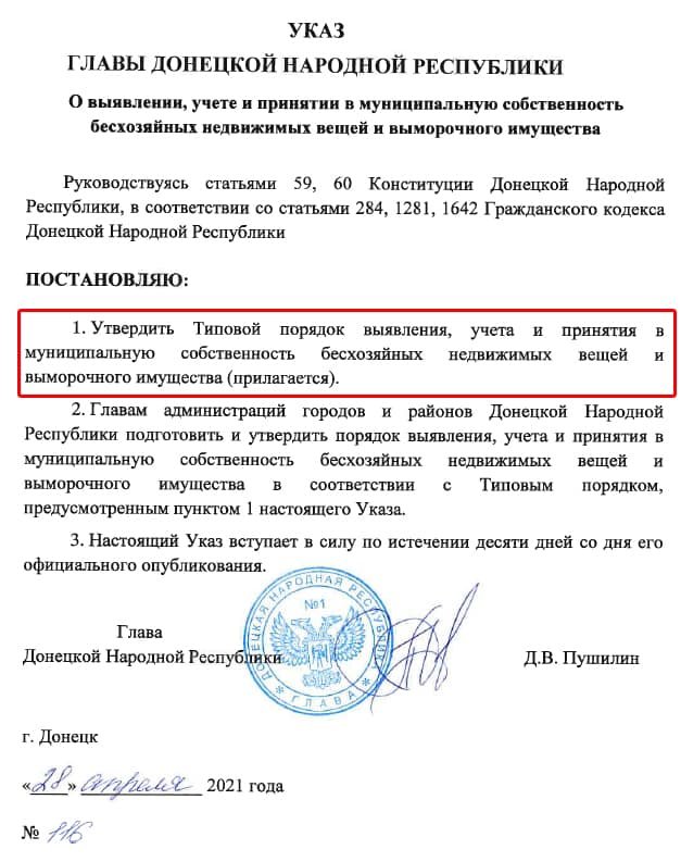 "Безгоспність" житла повинна бути встановлена протягом місяця після чого нерухомість "конфіскують". Територію ОРДО покинули сотні тисяч людей. Таким чином вся їх нерухомість буде присвоєна окупантами. Також мова йде про "нічийну" землю і комерційну нерухомість.