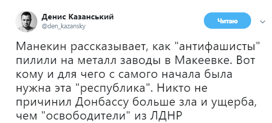 "Манекін розповідає, як" антифашисти "пиляли на метал заводи в Макіївці. Ось кому і для чого з самого початку була потрібна ця" республіка ". Ніхто не заподіяв Донбасу більше зла і шкоди, ніж" визволителі "з ЛДНР", - йдеться в повідомленні.