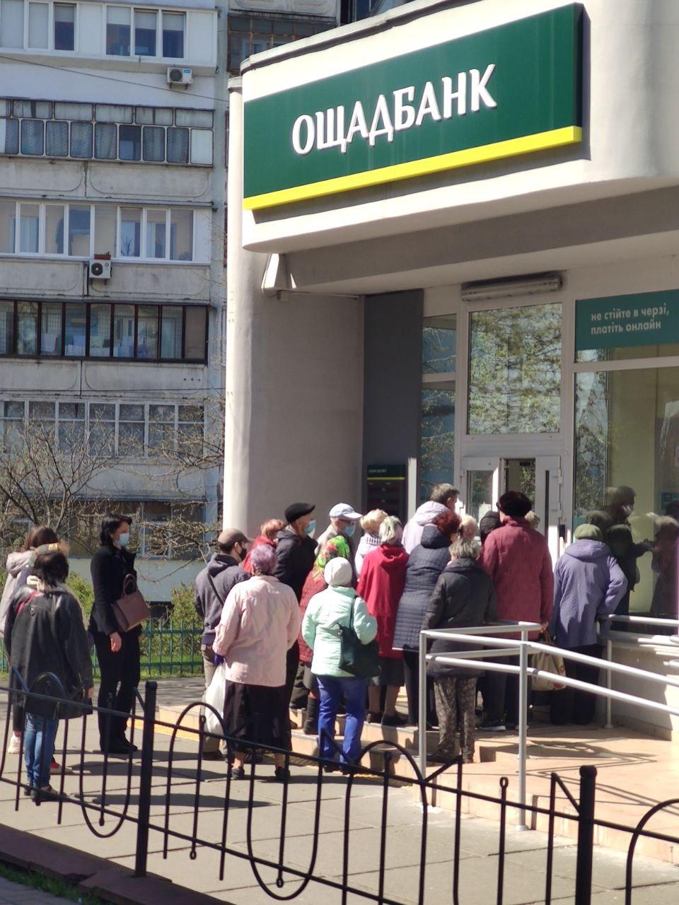 Ощадбанк в період карантину обмежує кількість людей, які можуть одночасно знаходитися в тому чи іншому відділенні. У зв'язку з цим біля входу утворюються черги охочих потрапити всередину.