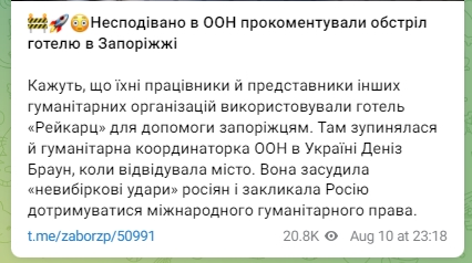 "Несподівано в ООН прокоментували обстріл готелю в Запоріжжі. Кажуть, що їхні працівники й представники інших гуманітарних організацій використовували готель "Рейкарц" для допомоги запоріжцям. Там зупинялася й гуманітарна координаторка ООН в Україні Деніз Браун, коли відвідувала місто. Вона засудила "невибіркові удари" росіян і закликала Росію дотримуватися міжнародного гуманітарного права", - йдеться у повідомленні.