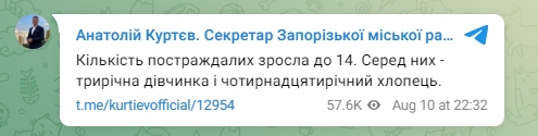 Секретар Запорізької міської ради Анатолій Куртєв повідомив, що внаслідок удару було поранено трирічну дівчинку.