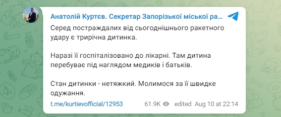 "Серед постраждалих від сьогоднішнього ракетного удару є трирічна дитина. Зараз вона госпіталізована до лікарні. Там дитина перебуває під наглядом медиків та батьків. Стан дитини – неважкий. Молимося за його швидке одужання", - написав Куртєв.