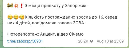 "Кількість постраждалих зросла до 16, серед них 4 дітей, повідомляє глава ЗОВА", - йдеться в повідомленні.