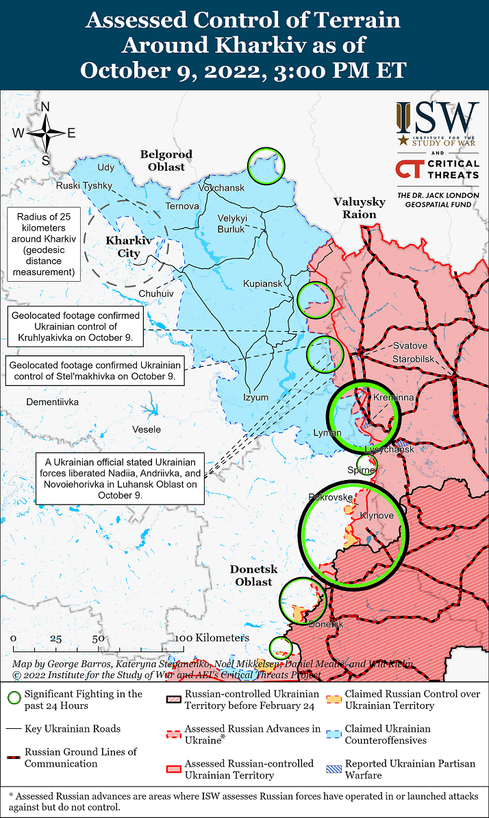 На сході України українські бійці продовжують рухатися у бік Сватового – за кілька днів вони просунулися на 10 км. Ворог всіляко цьому перешкоджає та атакує у цьому напрямку – на кордоні з Росією, а також на північний схід від Лиману. Деякі аналітики вважають, що найближчими днями буде звільнено населені пункти Першотравневе та Невське. Також штурмові дії Росія здійснює на південному заході від Донецька.