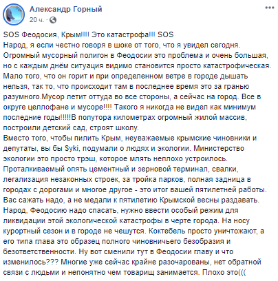 "SOS Феодосія, Крим!!!! Це катастрофа!!! SOS. Народ, я якщо чесно кажучи в шоці від того, що я побачив сьогодні. Величезний сміттєвий полігон в Феодосії. Це проблема і дуже велика, але з кожним днем ситуація мабуть стає просто катастрофічною. Мало того, що він горить і при певному вітрі в місті дихати не можна, так то, що відбувається там останнім часом це за гранню разумного.Мусор летить звідти на всі боки, а зараз на місто. все в окрузі целофані і смітті!!!! Такого я ніколи не бачив, як мінімум останні роки!!!!! В півтора кілометрах про Грімне житловий масив, побудували дитячий сад, будують школу", - написав він.