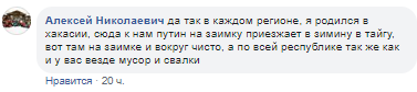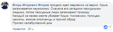 "Так в кожному регіоні, я народився в Хакасії, сюди до нас путин на заїмку приїжджає в Зиміну в тайгу, ось там на заїмці і навколо чисто, а по всій республіці так само як і у вас скрізь сміття і звалища", "процес йде повільно але впевнено. Крим загажують невблаганно. Спочатку його загадили паскудними людьми, потім паскудні люди плюндрують природу. Кожен на своєму місці вбиває Крим. Чиновники, поліцаї, чекісти, всякі ополченці і інший набрід. Пропав калабуховський будинок", "Зате Крим наш!", - пишуть користувачі.