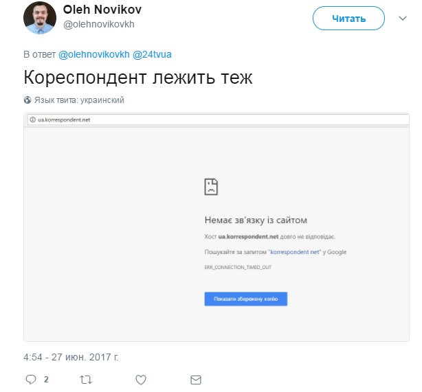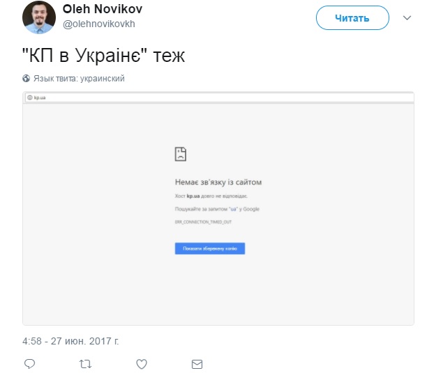 Також він зазначив, що в результат кібератаки припинили працювати сайти таких ЗМІ, як "Кореспондент" і "Комсомольська правда в Україні". picture