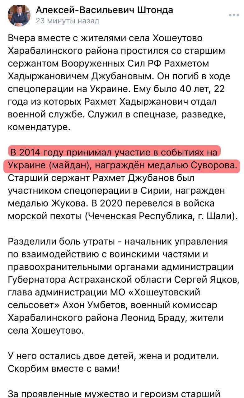 У некролозі окупанта зазначені його "заслуги перед Батьківщиною", серед яких – участь у подіях Революції Гідності, а також у бойових діях у Сирії та Україні. За масові вбивства цивільного населення Джубанова було представлено до кількох нагород.