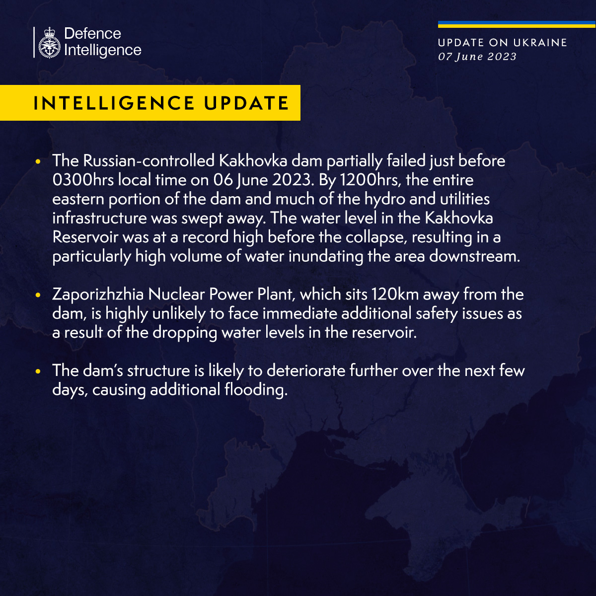 "Каховська ГЕС, контрольована Росією, частково була зруйнована близько 3-ї години ранку 6 червня 2023 року. До 12:00 вся східна частина греблі та велика частина гідро- та інженерної інфраструктури були знесені. При цьому рівень води в Каховському водосховищі перед обваленням був рекордно високим, що спричинило затоплення території нижче за течією особливо великим об'ємом води", - йдеться у повідомленні.