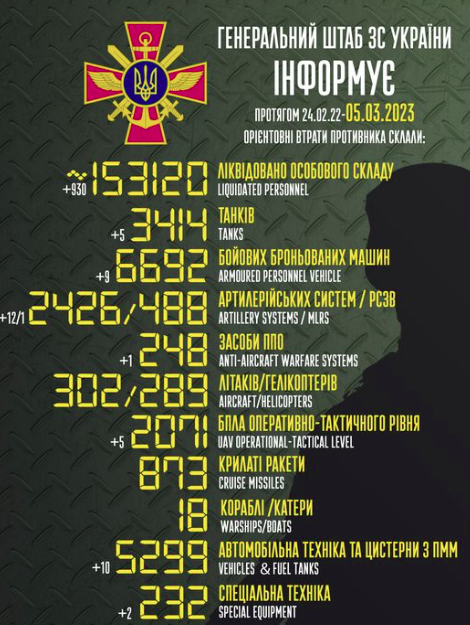 Загальні втрати особового складу ЗС РФ з початку повномасштабного вторгнення становлять 153 120 осіб.
