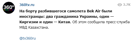 На борту судна Fokker-100 авіакомпанії Bek Air, що розбився у місті Алмати, були іноземці: два громадянина України, один - Киргизії і один - Китаю.