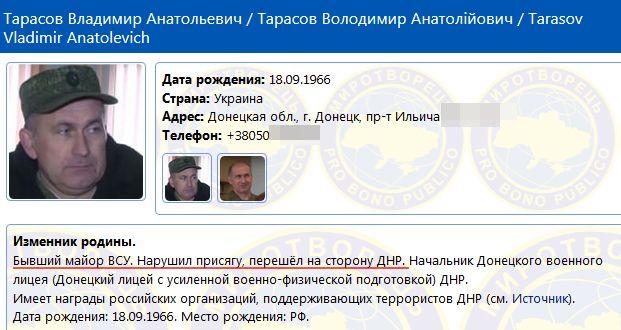 За даними "Миротворця", Тарасов був родом з Росії, народився в 1966 році. Працював "начальником" Донецького військового ліцею у бойовиків ДНР. Мав нагороди російських організацій, що підтримують окупантів.