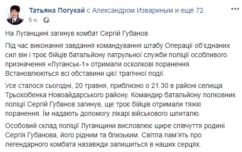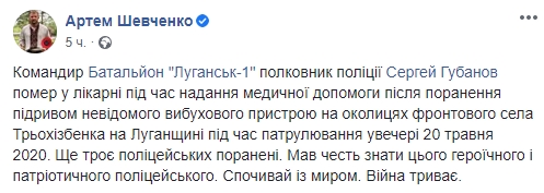 "Командир Батальйону "Луганськ-1" полковник поліції Сергій Губанов помер в лікарні під час надання медичної допомоги після поранення підривом невідомого вибухового пристрою в околицях фронтового села Трьохізбенка на Луганщині під час патрулювання ввечері 20 травня 2020. Ще троє поліцейських поранені", - пише він .