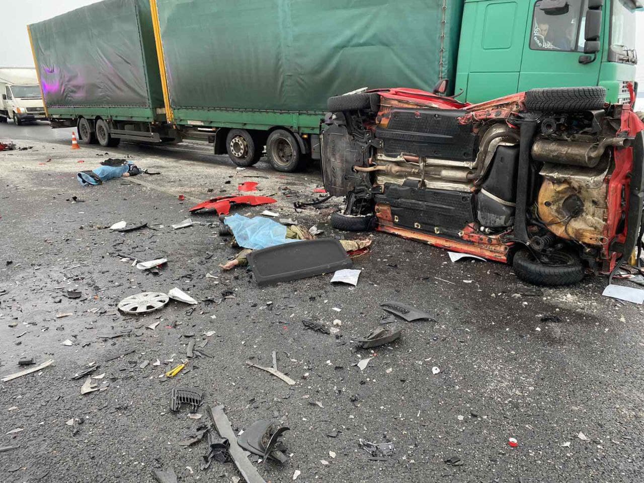 На відео, яке зняв один з водіїв, що проїжджали повз, видно, що аварія сталася за участю декількох авто. Одне з них на даху і повністю понівечене.