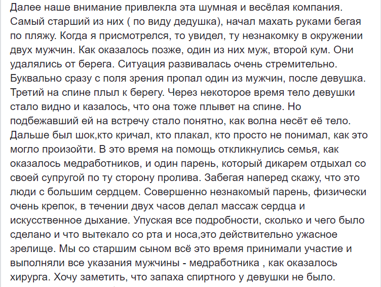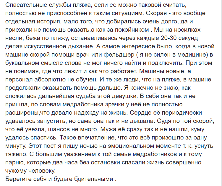 Відпочивальники самі несли на ношах тіло жінки та зупинялися кожні 20 – 30 секунд, роблячи штучне дихання. Натомість лікар у "швидкій" нічого не міг знайти та підключити необхідне обладнання. Відтак, ті ж самі люди з пляжу продовжували надавати медичну допомогу жінці вже в машині.