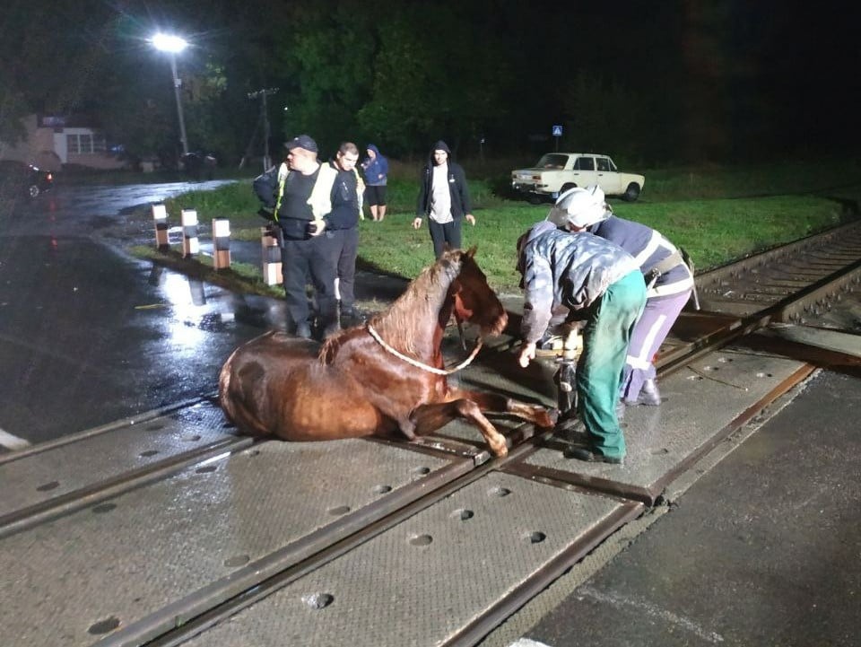 "Звідки тільки не доводиться рятувати тварин нашим рятувальникам. У м. Рожище Волинської області надзвичайники вивільнили коня, що потрапив копитом в отвір між рейковими коліями та бетонною плитою залізничного переїзду", - йдеться в повідомленні.