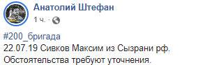"200 бригада. 22.07.19 Сівков Максим з Сизрані рф. Обставини вимагають уточнення", - йдеться у повідомленні.