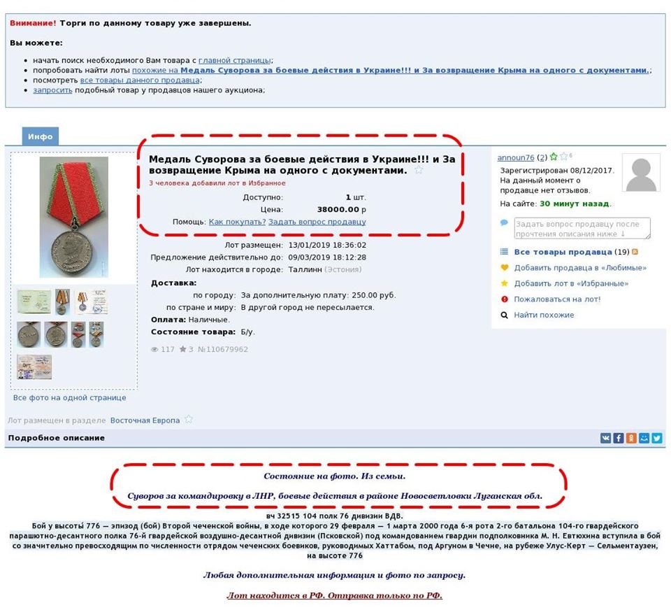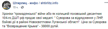 "Хроніки "громадянської" війни або як колишній псковський десантник 104-го ДШП рф продає свої медалі: "Суворова за відрядження у ЛНР, бойові дії в районі Новосвєтловки Луганської області". Ціна за Суворова та "Возвращение Крыма" - 38000 рупій", - йдеться у повідомленні.