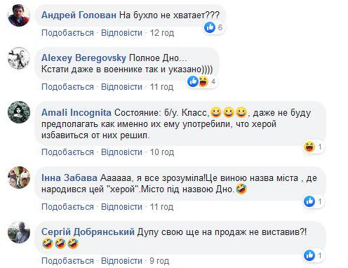 "На бухло не вистачає???", "Повне Дно... До речі навіть у військовику так і зазначено)))", "Стан: б/у. Клас, навіть не буду припускати як саме їх йому вжили, що херой позбутися них вирішив", "Аааааа, я все зрозуміла!Це виною назва міста, де народився цей "херой". Місто під назвою Дно", "Ду*у свою ще на продаж не виставив?!", - пишуть коментатори.