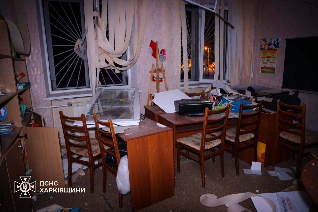 Одне з ворожих влучань прийшлося на будівлю закладу освіти, що призвело до пожежі та часткового руйнування споруди. Крім того, вибуховою хвилею та уламками пошкоджено багатоповерхові будинки, розташовані неподалік від епіцентру вибуху. Рятувальники зафіксували ще одне влучання на території району, де також виникла пожежа.