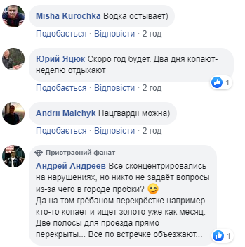 "Всі сконцентрувалися на порушеннях, але ніхто не задає питання, через що в місті пробки? Так на тому перехресті (вулиць Кирилівської та Сирецької) хтось копає та шукає золото вже місяць. Дві смуги для проїзду перекриті ... Всі по зустрічній об'їжджають", - зазначив Андрій Андрєєв.
