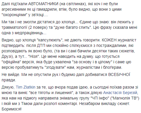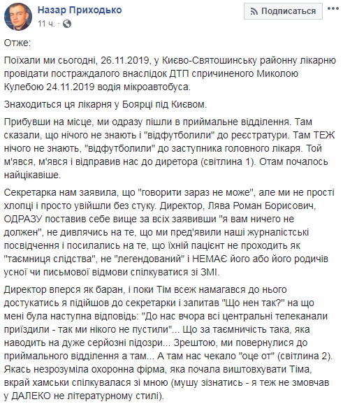 Він розповів про те, як разом з іншим блогером і активістом, Тімом Златкіним, вони прибули до Києво-Святошинської районної лікарні провідати потерпілого водія мікроавтобуса, який зіткнувся з автомобілем Кулеби.