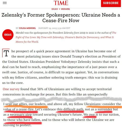 "Мендель в статті для Time "Колишня речниця Зеленського: Україні зараз потрібне припинення вогню": "Я тут, щоб спростувати думку, що лише продовження війни врятує Україну". Україні потрібно термінове припинення вогню, оскільки це "шанс зберегти державу, економіку і сам народ"", - згадує блогер.