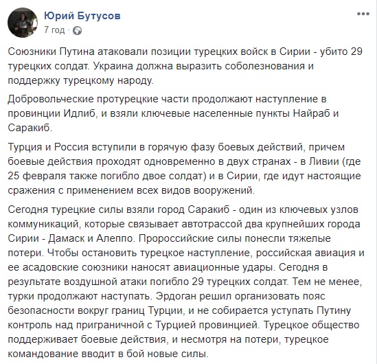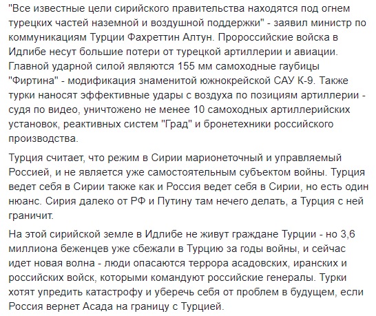 Український журналіст Юрій Бутусов: "Туреччина вважає, що режим в Сирії маріонетковий і керований Росією, і не є вже самостійним суб'єктом війни. Туреччина веде себе в Сирії так само, як і Росія поводиться в Сирії, але є один нюанс. Сирія далеко від РФ і Путіну там нічого робити, а Туреччина з нею межує".