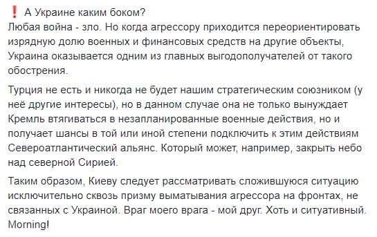 Туреччина не є і ніколи не буде нашим стратегічним союзником (у неї інші інтереси), але в даному випадку вона не тільки змушує Кремль втягуватися в незаплановані військові дії, а й отримує шанси в тій чи іншій мірі підключити до цих дій Північноатлантичний альянс. Який може, наприклад, закрити небо над північною Сирією.