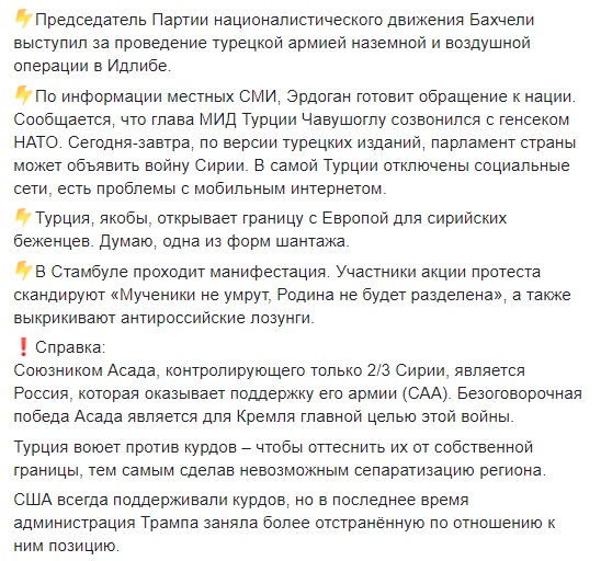 Туреччина жорстко відреагувала на удар по своїм позиціях в Сирії. Вище керівництво країни відзначає, що готове до повномасштабної війни з режимом сирійського лідера Башара Асада. За останніми даними, в результаті удару по турецьким позиціям загинуло 33 військових.