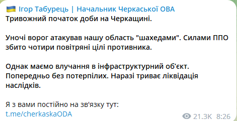 Додамо, що близько 1:20 в області працювала ППО. Голова ОВА попереджав про підвищену небезпеку на території Черкащини.