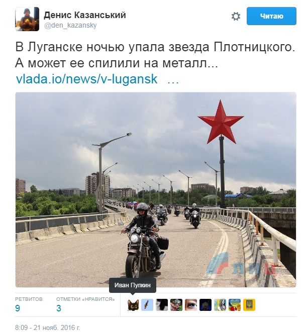 У Луганську, який знаходиться під контролем бойовиків так званої ЛНР, в ніч з 20 на 21 листопада впав восьмиметровий пам'ятний знак "Зірка перемоги", який нещодавно вже намагалися прорвати невідомі.