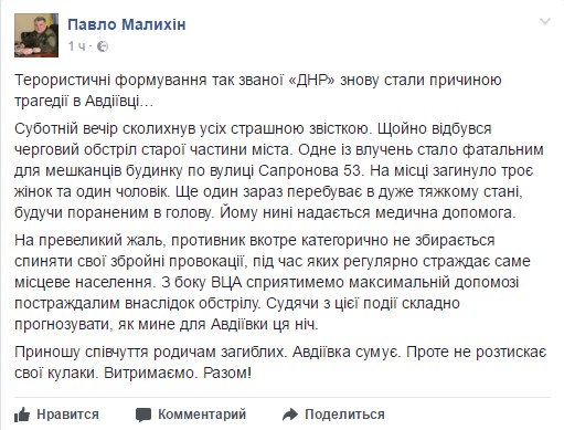 Раніше голова Донецької обласної військово-цивільної адміністрації Павло Жебрівський повідомив, що снаряд бойовиків потрапив у двір житлового будинку в Авдіївці, в результаті чого загинули чотири людини.
