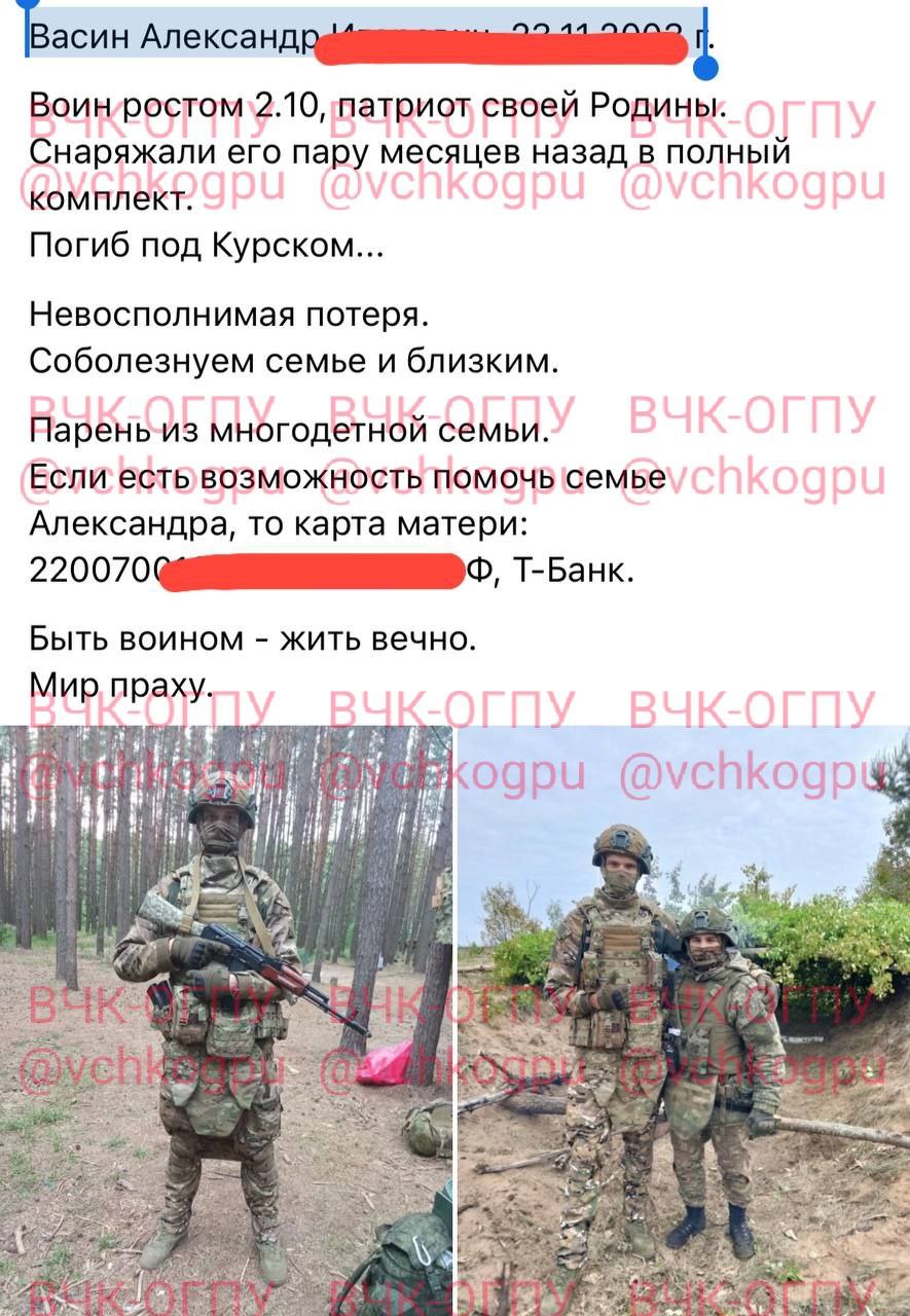 У квітні 2024 року військовослужбовців, у тому числі й Олександра Васіна, відправили під Курськ у "тепле місце" захищати кордон. На зміну спецназівцям, яких передислокували на допомогу групі "Північ". На кордоні Курської області більшість із них - нещодавніх строковиків - загинули під час атаки та наступу ЗСУ ", - йдеться в повідомленні.