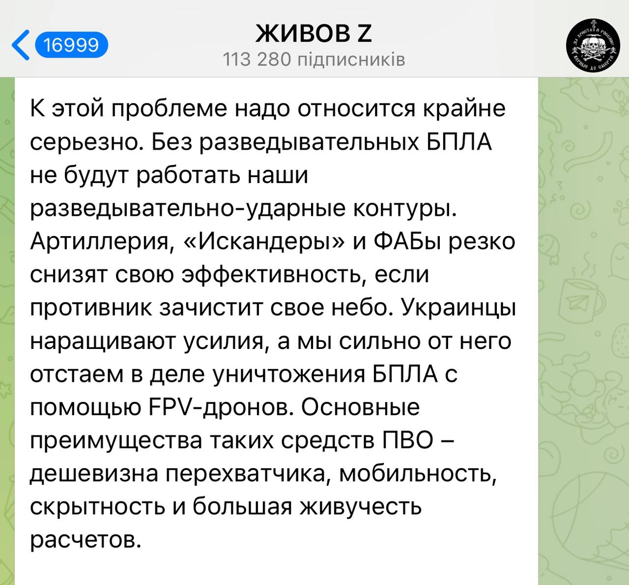 "Окупанти скаржаться, що ЗСУ навчилися ефективно знищувати російські дрони-розвідники за допомогою fpv-дронів. Воєнкор Живов пише, що раніше безпілотник міг працювати кілька місяців, тепер же збивається швидко і дешево. Більше не потрібно витрачати зенітні ракети".