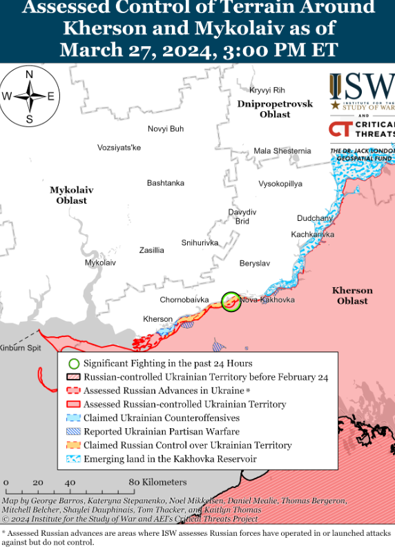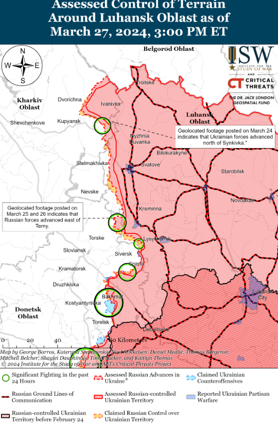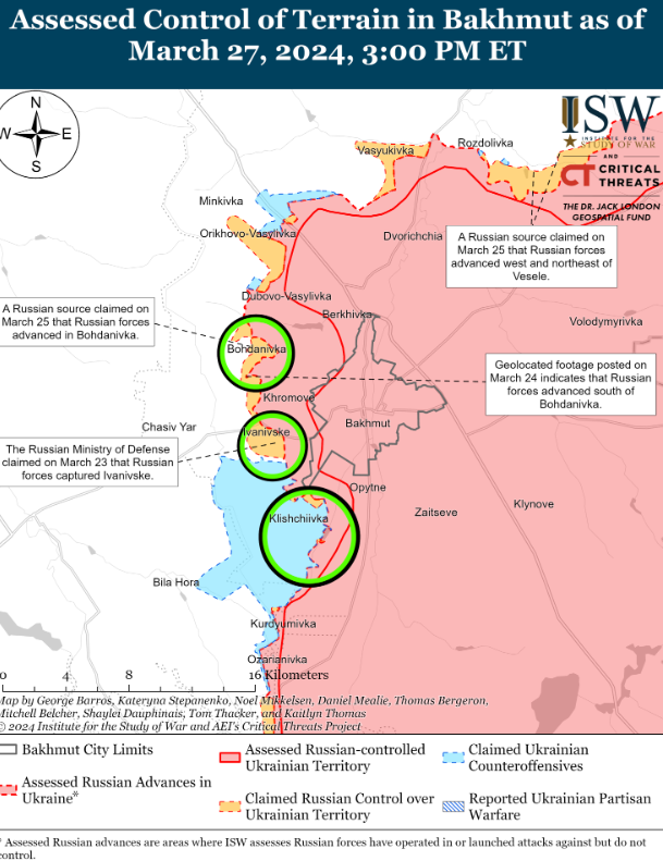 ISW повідомляє, що російські війська просунулися на захід від Бахмута, хоча 27 березня не було підтверджених змін лінії фронту в цьому районі. Позиційні бої тривали: