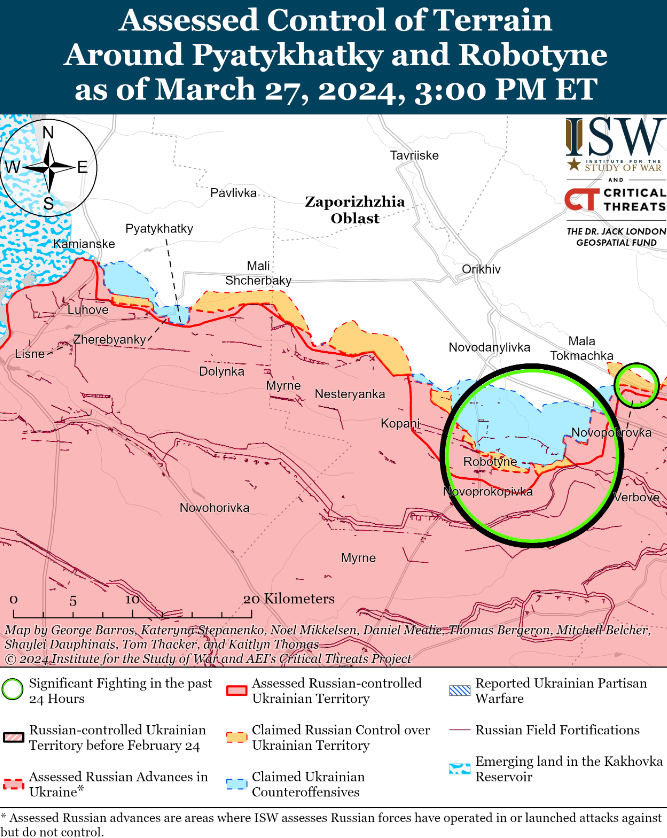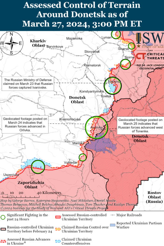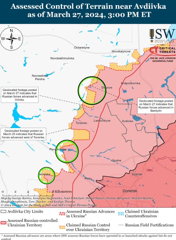 Російські сили нещодавно просунулися на захід від Авдіївки під час позиційних боїв у цьому районі 27 березня. Геолокаційні кадри, опубліковані 27 березня, показують, що російські сили нещодавно просунулися в межах Бердичів (на північний захід від Авдіївки) та в Орлівці (на захід від Авдіївки).