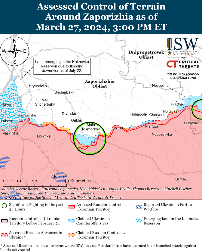 Крім того, 27 березня на кордоні Донецько-Запорізької області позиційні бойові дії тривали на південь від Великої Новосілки в районі Старомайорського та Урожайного.