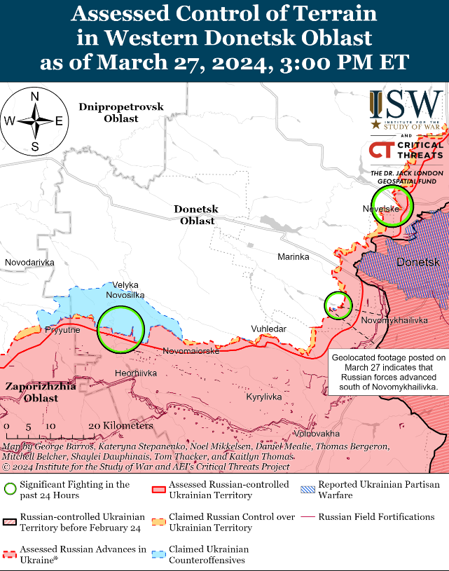 Фахівці зазначають, що російські війська нещодавно просунулися на південний захід від міста Донецька на тлі позиційних боїв на захід і південний захід від міста Донецька 27 березня. Геолокаційні кадри, опубліковані 27 березня, показують, що російські війська нещодавно просунулися в межах центральної Новомихайлівки (на південний захід від міста Донецьк).