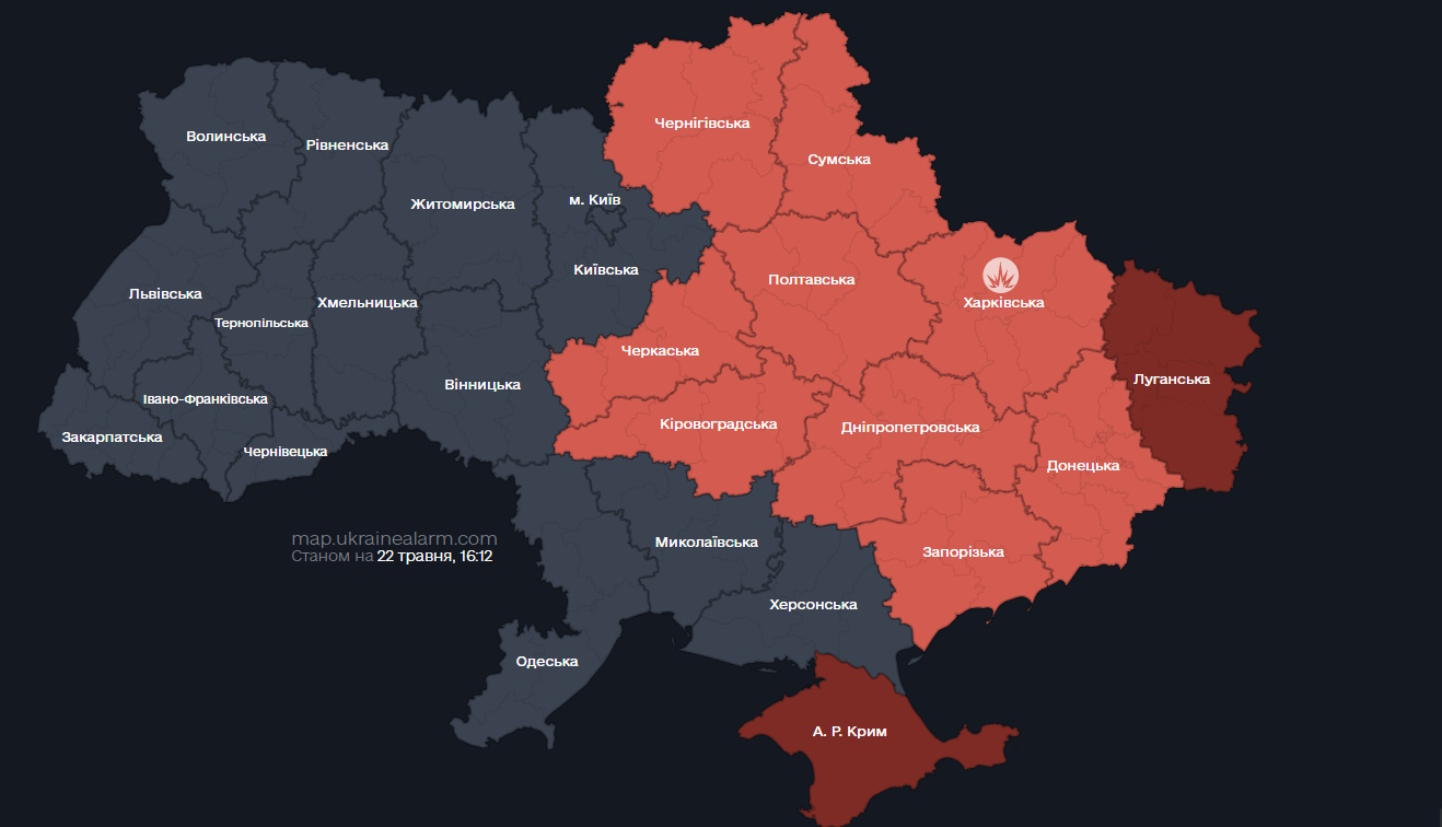 Нині територія, де оголошено повітряну тривогу, виглядає так.
