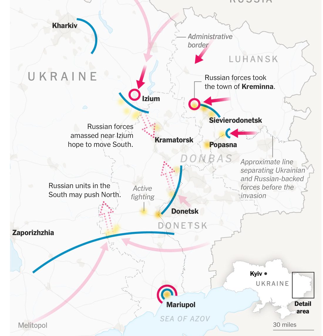 "Російські війська можуть спробувати попрямувати до Краматорська та з південного сходу, з-під Донецька, щоб відрізати українські війська з двох напрямків. У районах навколо Донецька протягом останнього місяця точилися безперервні бої, жителі повідомляли про часті обстріли", - сказали військові аналітики виданню.