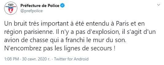 Префектура поліції Парижа повідомила, що "вибуху" в Парижі не було. Звук викликав літаком, який, пролітаючи над містом, подолав звуковий бар'єр.