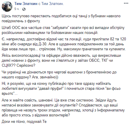 "Щось поступово перестають подобатися оці танці з бубнами навколо повідомлень з фронту. Штаб ООС все частіше став "забувати" казати про всі випадки обстрілу російськими найманцями та бойовиками наших позицій. Є, наприклад, достовірно відомі час та локації, куди прилітали 82 та 120 міни або снаряди від Д-30. Але в щоденних повідомленнях за той день йде мова лише про... стрілкове. Ну, максимум гранатомети та кулемети", - пише Златкін.