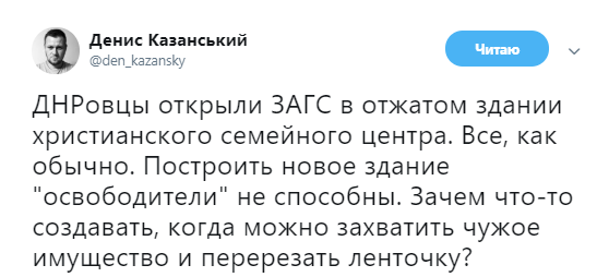"ДНРовци відкрили РАЦС в отжатом будівлі християнського сімейного центру. Все, як зазвичай. Побудувати нову будівлю "визволителі" не здатні. Навіщо щось створювати, коли можна захопити чуже майно і перерізати стрічку?", - йдеться в повідомленні.