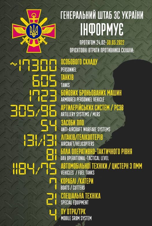 Загальні бойові втрати противника з 24.02 до 30.03 орієнтовно склали: