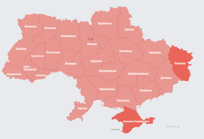 Карти повітряних тривог свідчить, що ракетну небезпеку оголошено у всіх регіонах України.