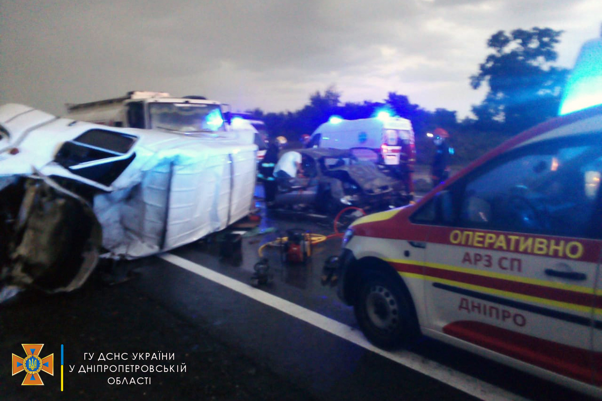 "Для запобігання виникнення пожежі бійці ДСНС від"єднали елементи живлення акумуляторів з автомобілів та змили залишки паливно-мастильних матеріалів з проїжджої частини автошляху. До місця події залучено 9 чоловік особового складу та 3 одиниці техніки Головного управління ДСНС України у Дніпропетровській області", - йдеться в повідомленні.