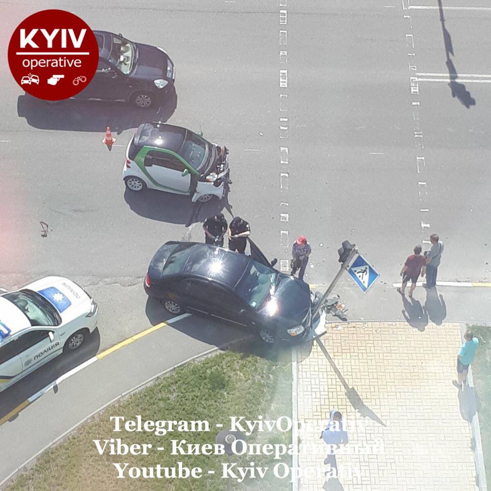 Дорожньо-транспортна пригода сталася за участі автомобілів КІА та Smart. Від удару при зіткненні автомобіль КІА в"їхав у дорожній знак і вилетів на тротуар.